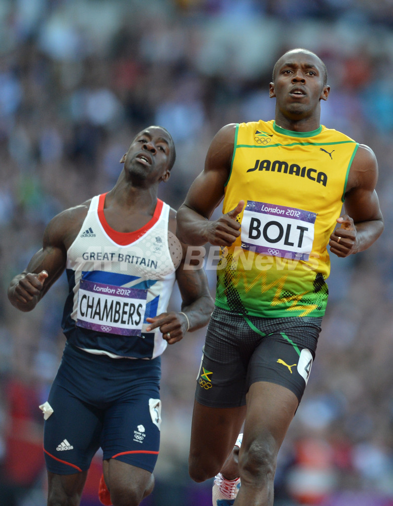 決勝に進出したジャマイカのウサイン・ボルト(右、2012年8月5日撮影)。(c)AFP/ERIC FEFERBERG