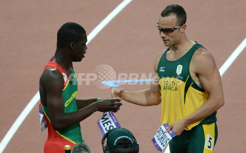 レース後にキラニ・ジェームス(Kirani James)とビプスを交換するオスカー・ピストリウス(2012年8月5日撮影)。(c)AFP/JOHANNES EISELE