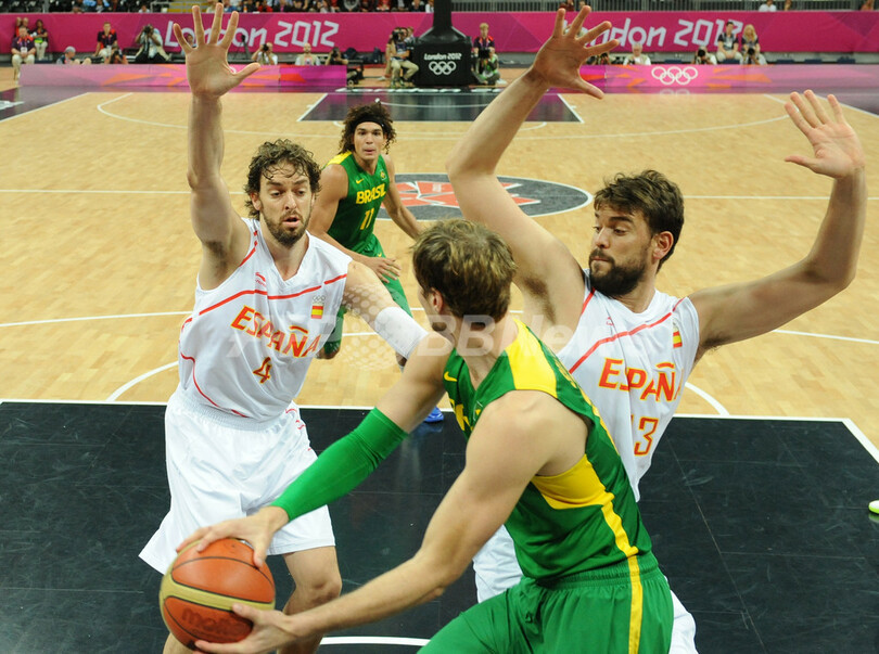スペインのパウ・ガソル(Pau Gasol、左)とマルク・ガソル(Marc Gasol、右)のダブルチーム・ディフェンスを受けるブラジルのティアゴ・スプリッテル(Tiago Splitter、中央、2012年8月6日撮影)。(c)AFP/MARK RALSTON