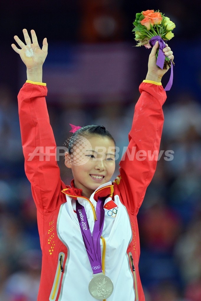 銀メダルを獲得し、表彰式に臨む中国の何可欣(He Kexin、2012年8月6日撮影)。(c)AFP/BEN STANSALL