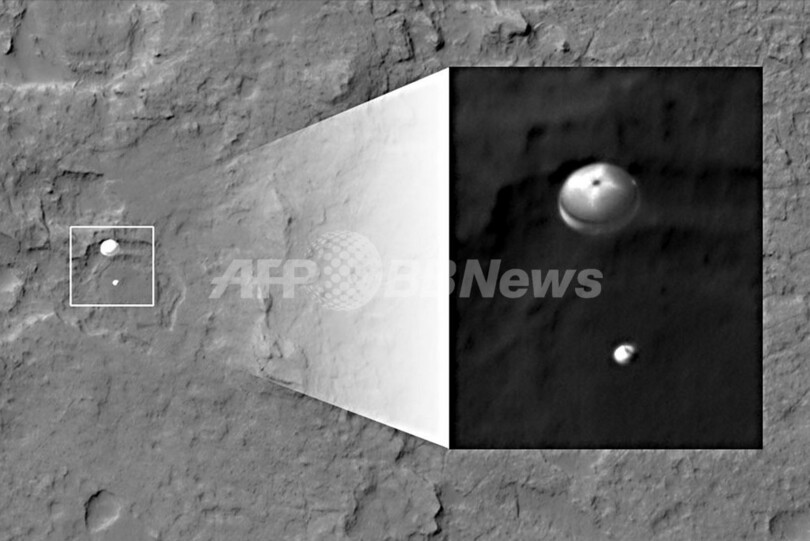 ニュース 環境・科学 キュリオシティーが撮影した火星の映像、NASA 2012年8月7日 10:47 発信地:パサデナ/米国 [ 北米 米国 ] このニュースをシェア ‹ › ❮ 6/7 ❯ 米航空宇宙局(NASA)は6日、火星探査車キュリオシティー(Curiosity)の火星着陸前後に撮影した映像を公開した。写真はNASAの火星探査機「マーズ・リコネサンス・オービター(Mars Reconnaissance Orbiter、MRO)」が捉えた火星表面に向けて降下中のキュリオシティーとパラシュート(左側の枠内)。右の枠内は明るさを変えて拡大したもの(2012年8月6日公開)。(c)AFP/NASA/JPL-Caltech TELEVISION 画像作成中 ! 【8月7日 AFP】米航空宇宙局(NASA)は6日、火星探査車キュリオシティー(Curiosity)の火星着陸前後に撮影した映像を公開した。(c)AFP 環境・科学 一覧へ> メディア・報道関係・法人の方向け 写真・動画 購入のお問合せ>