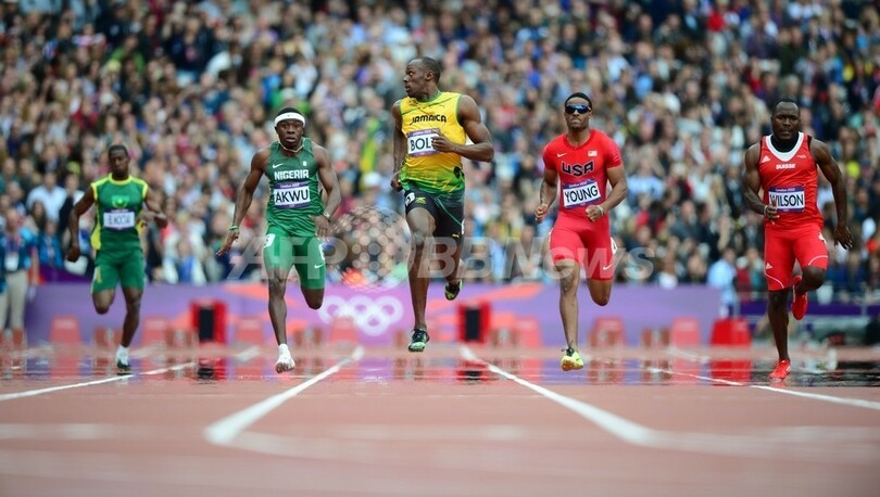 レースに臨むジャマイカのウサイン・ボルト(中央、2012年8月7日撮影)。(c)AFP/OLIVIER MORIN