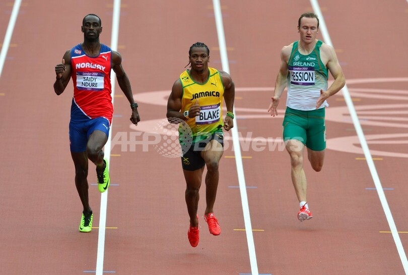 レースに臨む(左から)ノルウェーのジャイスマ・サイディ・ンドゥレ(Jaysuma Saidy Ndure)、ジャマイカのヨハン・ブレイク、アイルランドのポール・ヘッション(Paul Hession、2012年8月7日撮影)。(c)AFP/GABRIEL BOUYS