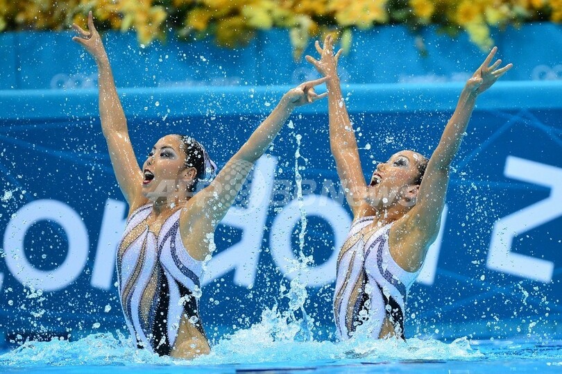 フリールーティン予選に臨む乾友紀子/小林千紗組(2012年8月6日撮影)。(c)AFP/FABRICE COFFRINI