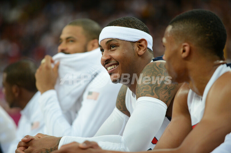 ベンチで試合を見つめる米国のカーメロ・アンソニー(Carmelo Anthony、2012年8月8日撮影)。(c)AFP/Getty Images/Jesse D. Garrabrant