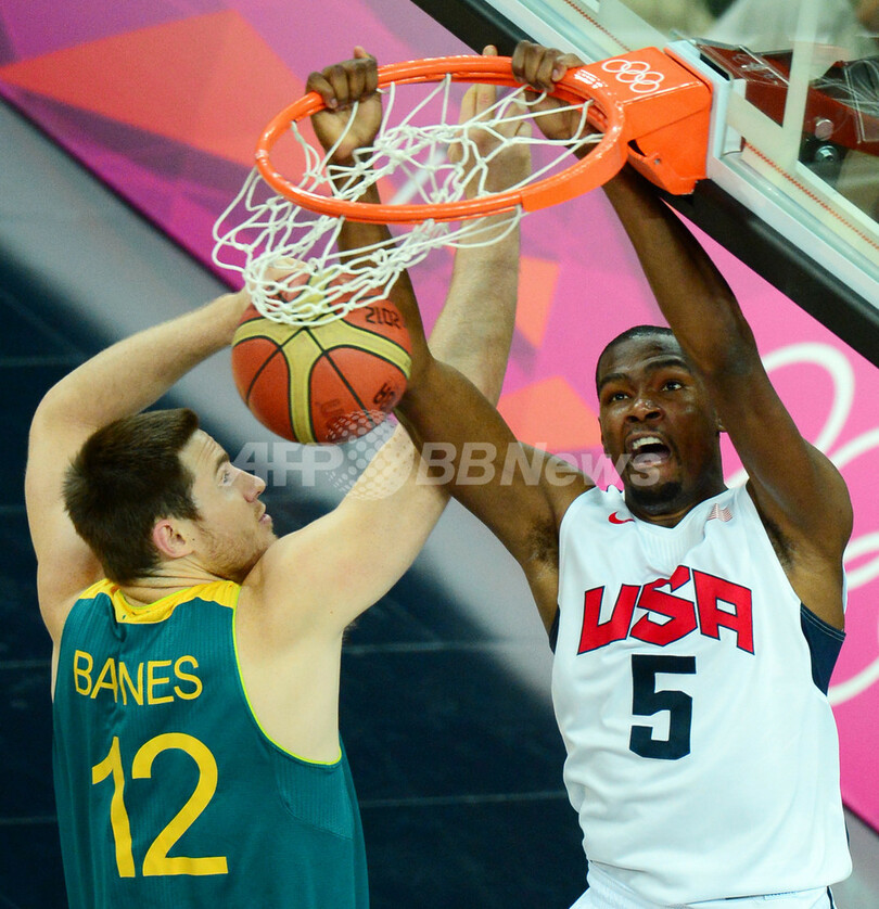 ダンクシュートを決める米国のケビン・デュラント(Kevin Durant、2012年8月8日撮影)。(c)AFP/EMMANUEL DUNAND