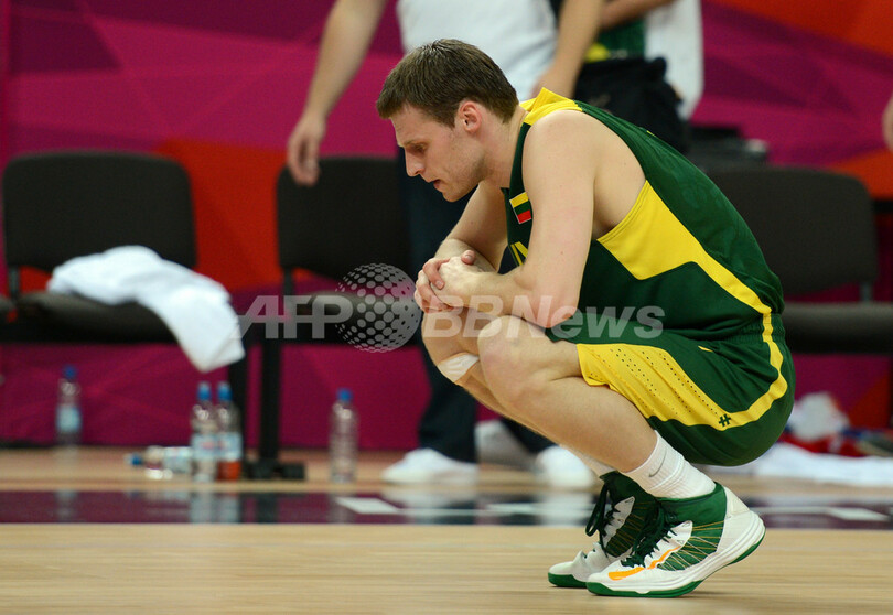 試合に敗れて落胆するリトアニアのマルチネス・ポシウス(Martynas Pocius、2012年8月8日撮影)。(c)AFP/TIMOTHY A. CLARY