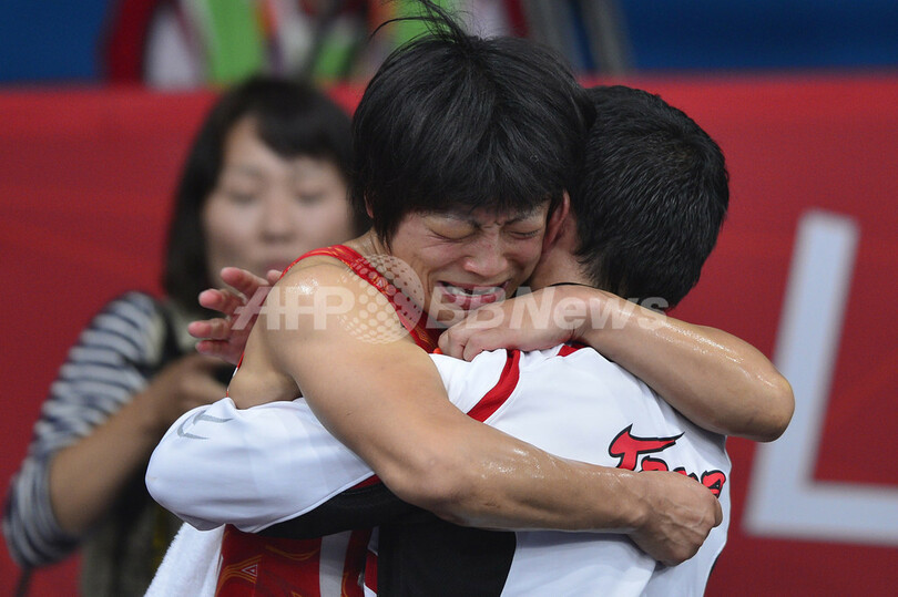 試合後、コーチと喜びを分かち合う小原日登美(2012年8月8日撮影)。(c)AFP/YURI CORTEZ