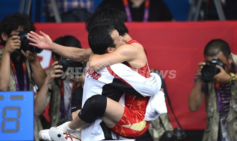 試合後、コーチと喜びを分かち合う小原日登美(2012年8月8日撮影)。(c)AFP/YURI CORTEZ