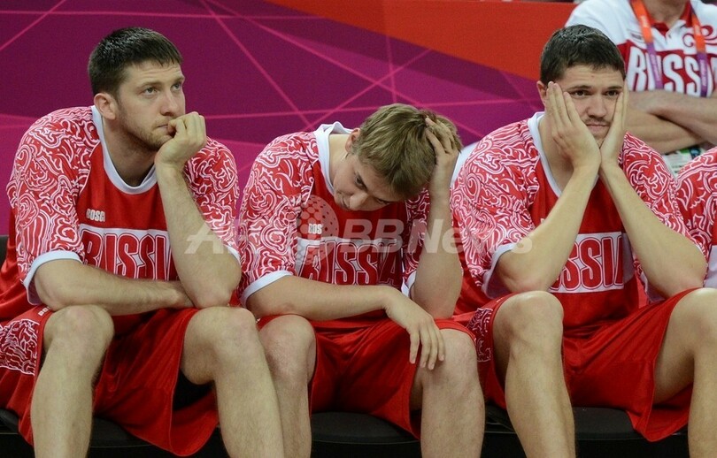 試合に敗れ、落胆するロシアの選手たち(2012年8月10日撮影)。(c)AFP/TIMOTHY A. CLARY