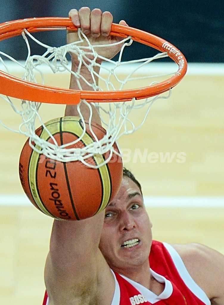 ダンクを決めるロシアのアレクサンダー・カーン(Alexander " Sasha" Kaun、2012年8月10日撮影)。(c)AFP/EMMANUEL DUNAND