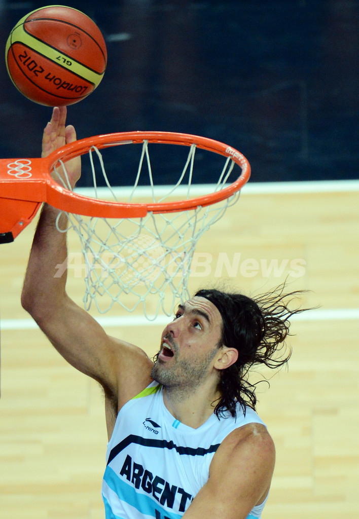 ゴール下から得点を狙うアルゼンチンのルイス・スコラ(Luis Scola、2012年8月10日撮影)。(c)AFP/EMMANUEL DUNAND