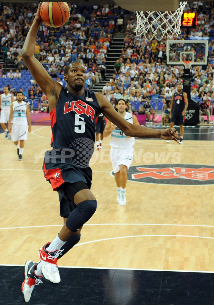 ダンクシュートを狙う米国のケビン・デュラント(Kevin Durant、2012年8月10日撮影)。(c)AFP/MARK RALSTON