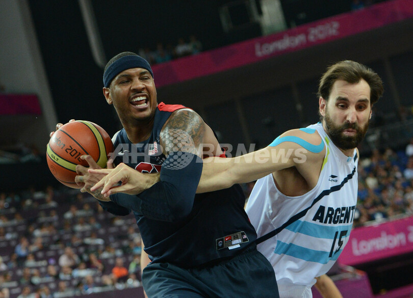 アルゼンチンの選手とボールを競る米国のカーメロ・アンソニー(Carmelo Anthony、2012年8月10日撮影)。(c)AFP/MARK RALSTON