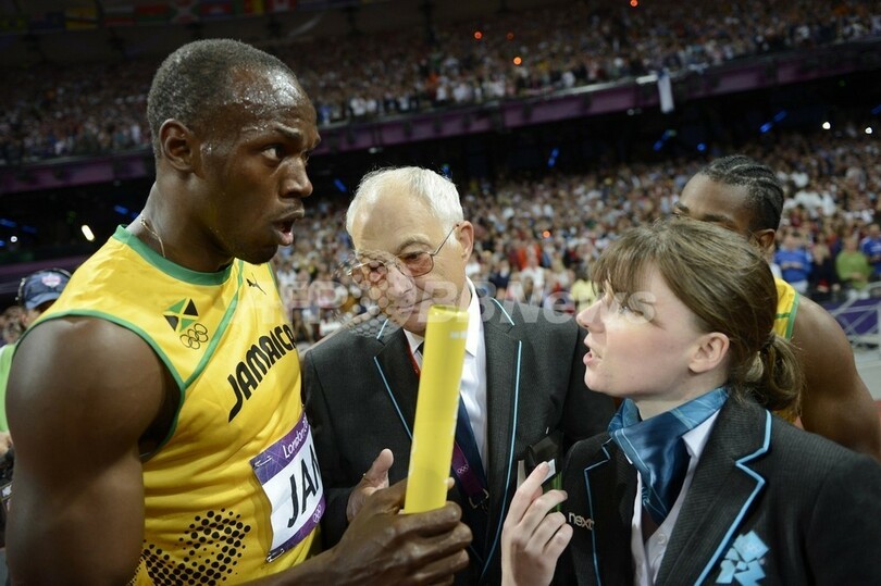 レース後、大会関係者にバトンの返却を求められるジャマイカのウサイン・ボルト(Usain Bolt、左、2012年8月11日撮影)。(c)AFP/ADRIAN DENNIS