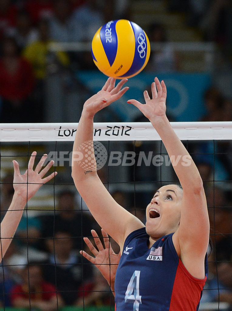 トスを上げる米国のリンゼイ・バーグ(Lindsey Berg、2012年8月11日撮影)。(c)AFP/KIRILL KUDRYAVTSEV