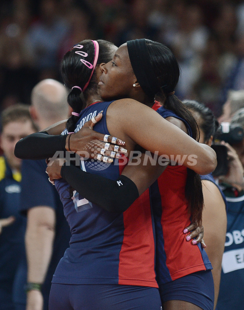 試合後に抱擁を交わす米国のダニエル・スコット(Danielle Scott-Arruda)とデスティニー・フッカー・ダンテ(Destinee Hooker Dante、2012年8月11日撮影)。(c)AFP/MANAN VATSYAYANA
