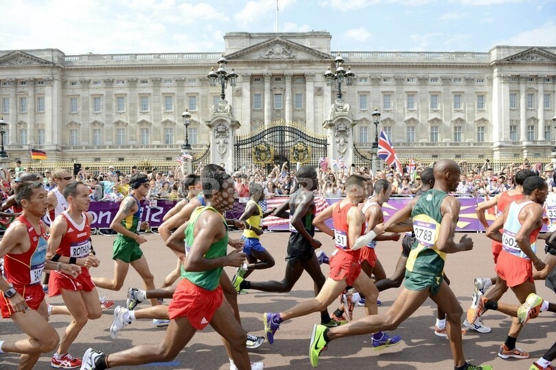 バッキンガム宮殿(Buckingham Palace)の前を通過する選手(2012年8月12日撮影)。(c)AFP/ADRIAN DENNIS