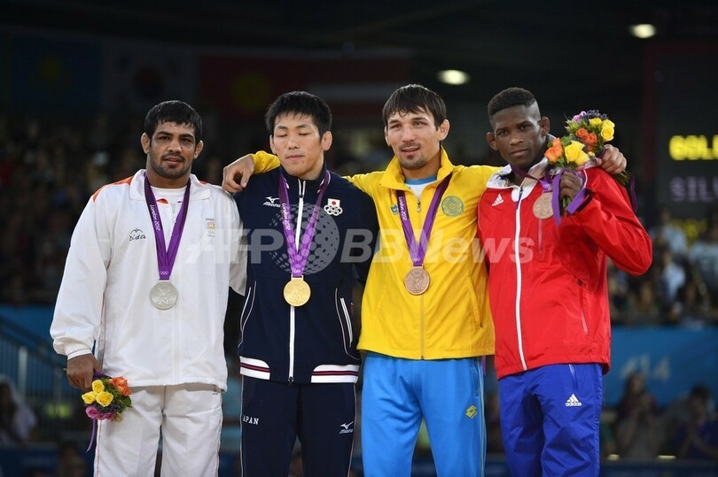 表彰式に臨む(左から)銀メダルのスシル・クマール、金メダルの米満達弘、銅メダルのアクチュレク・タナタロフ(Akzhurek Tanatarov)とリヴィアン・ロペス(Livan Lopez、2012年8月12日撮影)。(c)AFP/YURI CORTEZ
