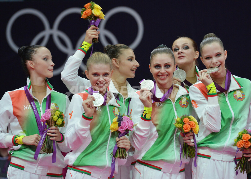 銀メダルを獲得し、表彰式に臨むベラルーシの選手(2012年8月12日撮影)。(c)AFP/BEN STANSALL