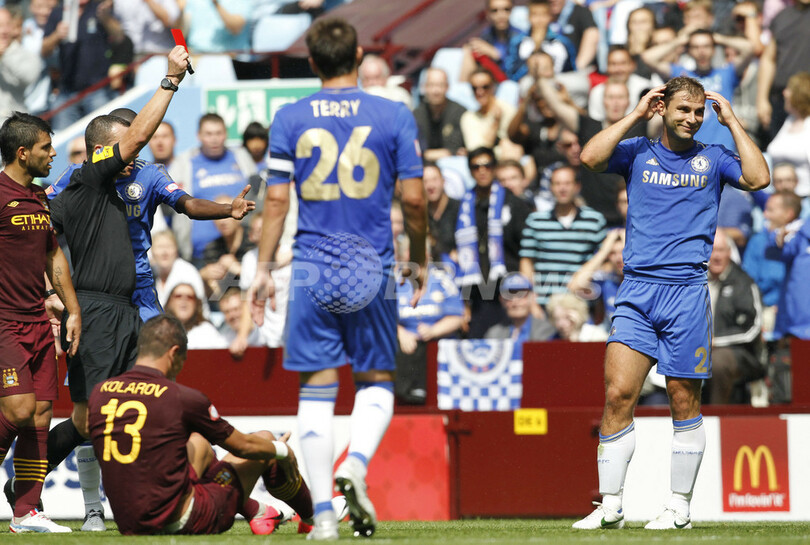 ケヴィン・フレンド(Kevin Friend)主審にレッドカードを提示され、落胆するチェルシーのブラニスラフ・イヴァノヴィッチ(Branislav Ivanovic、右、2012年8月12日撮影)。(c)AFP/IAN KINGTON
