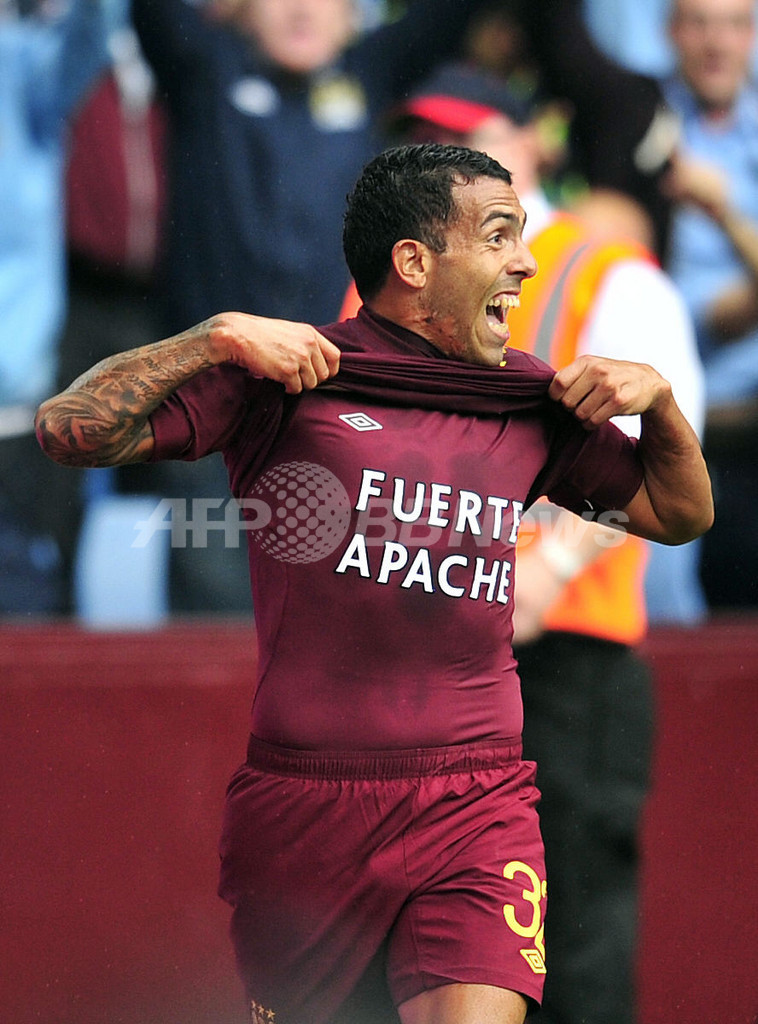 後半14分に勝ち越しゴールを決め歓喜するマンチェスター・シティのカルロス・テベス(Carlos Tevez、2012年8月12日撮影)。(c)AFP/GLYN KIRK