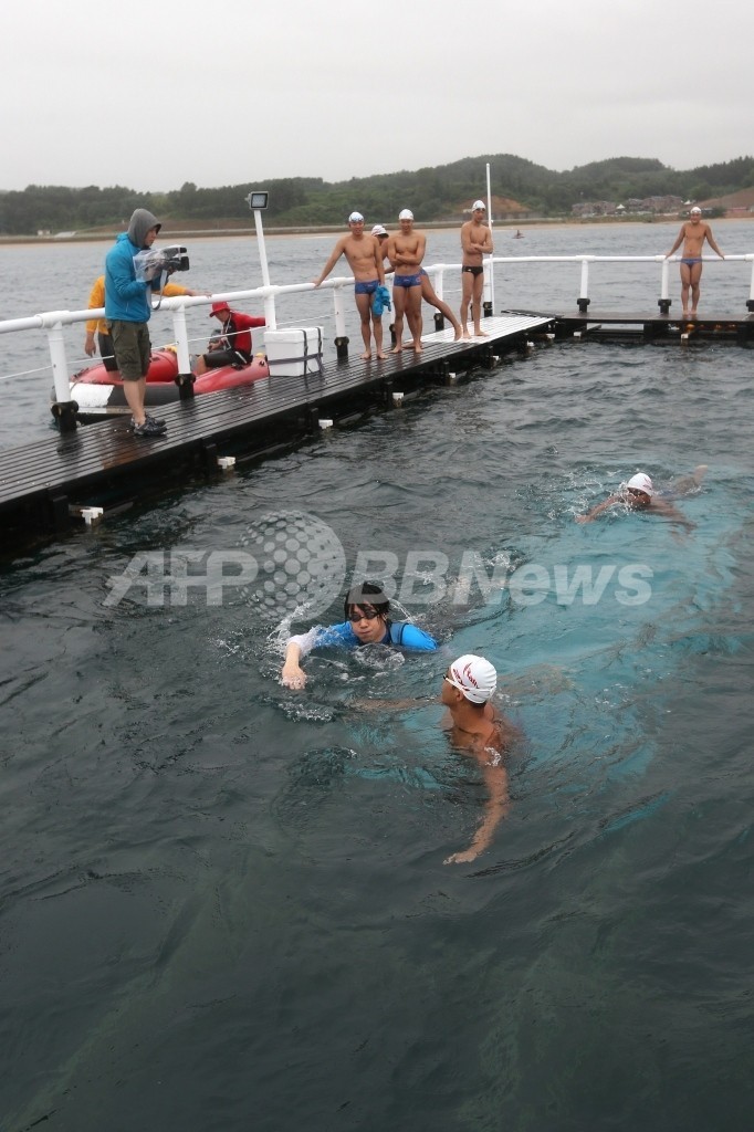 【8月13日 AFP】(写真追加)韓国の市民グループ数十人が13日、日韓両国が領有権を主張する竹島(Takeshima、韓国名・独島、Dokdo)までの230キロメートル遠泳リレーを開始した。