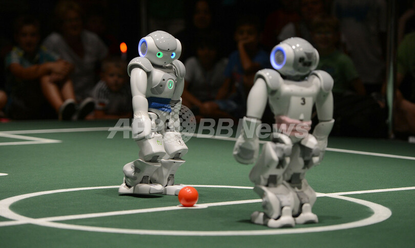 写真は会場でサッカーをするロボット(2012年8月13日撮影)。(c)AFP/PATRIK STOLLARZ