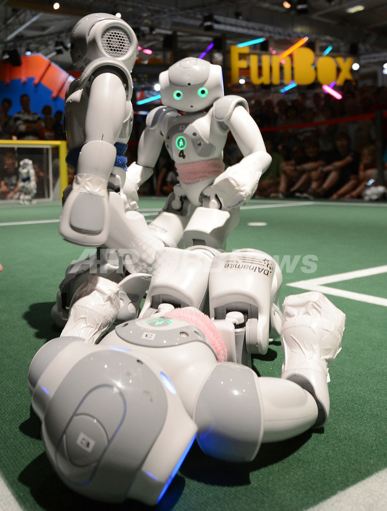 写真は会場でサッカーをするロボット(2012年8月13日撮影)。(c)AFP/PATRIK STOLLARZ