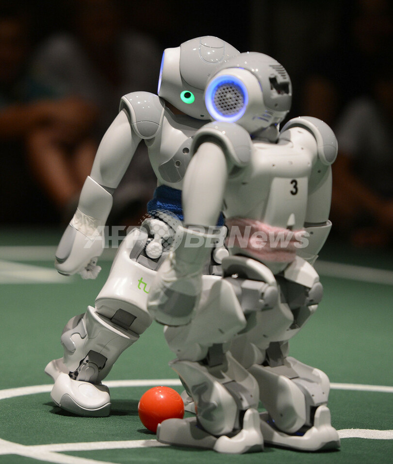写真は会場でサッカーをするロボット(2012年8月13日撮影)。(c)AFP/PATRIK STOLLARZ