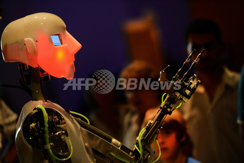 写真は会場に展示されたロボットの動きを追う少年(2012年8月13日撮影)。(c)AFP/PATRIK STOLLARZ