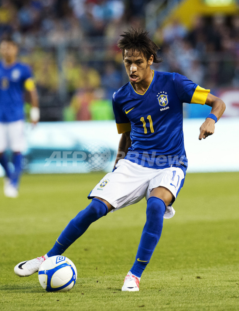 ボールをコントロールするブラジルのネイマール(Neymar da Silva Santos Junior、2012年8月15日撮影)。(c)AFP/FREDRIK SANDBERG