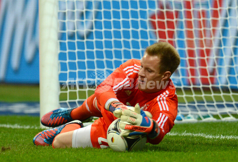 PKを止めるドイツのゴールキーパーGKマルクアンドレ・テル・シュテーゲン(Marc-Andre ter Stegen、2012年8月15日撮影)。(c)AFP/PATRIK STOLLARZ