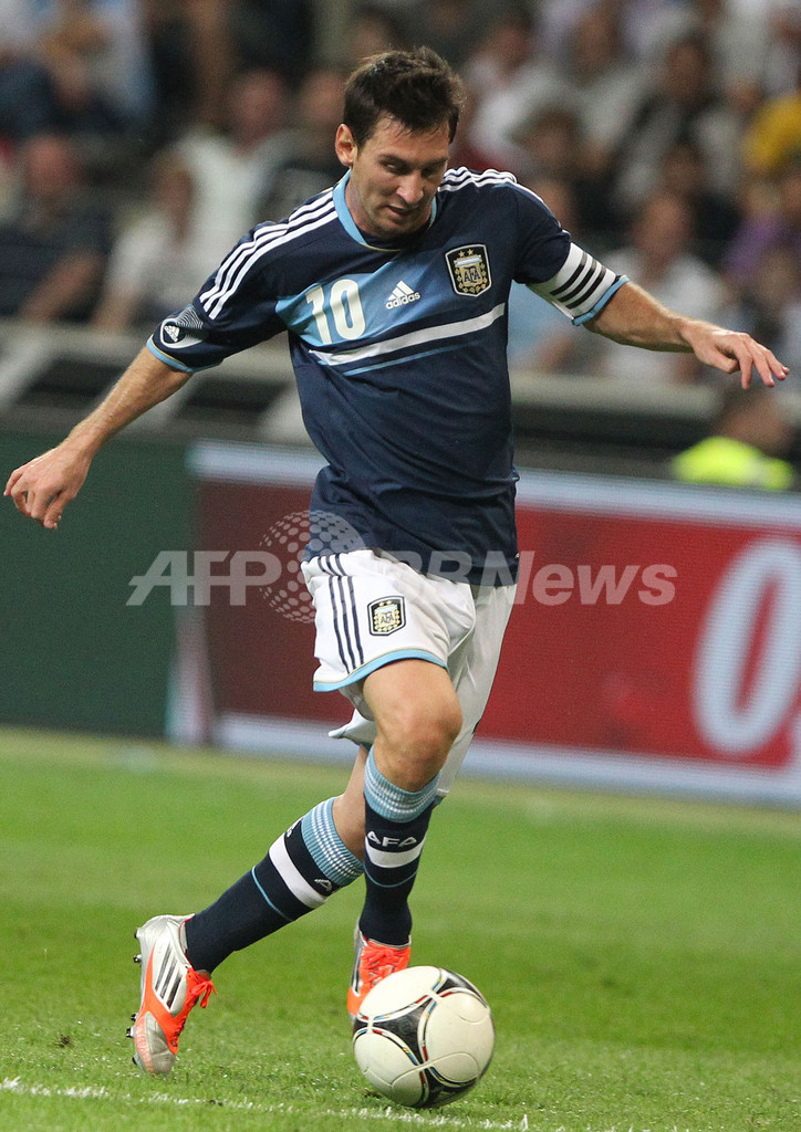 ドリブルでボールを運ぶアルゼンチンのリオネル・メッシ(Lionel Messi、2012年8月15日撮影)。(c)AFP/DANIEL ROLAND