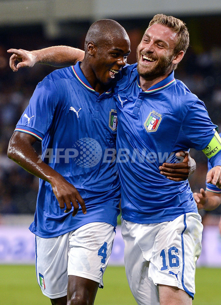 前半15分に先制点を挙げて、チームメイトのアンジェロ・オグボンナ(Angelo Ogbonna)と喜びを分かち合うイタリアのダニエレ・デ・ロッシ(Daniele De Rossi、2012年8月15日撮影)。(c)AFP/FABRICE COFFRINI