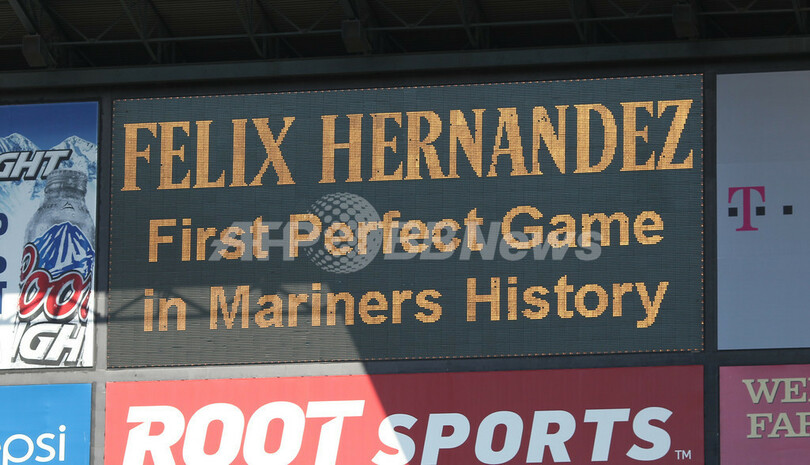 フェリックス・ヘルナンデス(Felix Hernandez)の完全試合達成を伝えるシアトル・マリナーズの本拠地セーフコ・フィールド(Safeco Field)の電光掲示板(2012年8月15日撮影)。(c)AFP/Getty Images/Otto Greule Jr