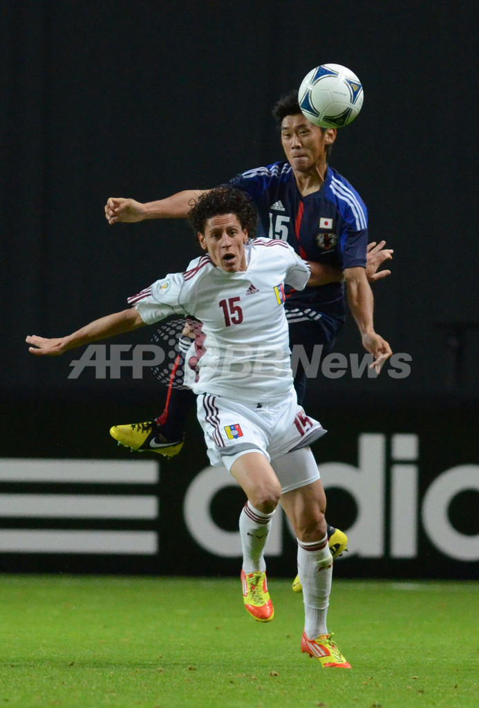 ベネズエラのマリオ・ロンドン(Mario Rondon)とボールを競る水本裕貴(Hiroki Mizumoto、2012年8月15日撮影)。(c)AFP/Takashi NOGUCHI
