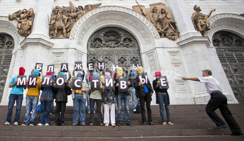 プッシー・ライオットの女性メンバー3人は今年2月、ここ救世主ハリストス大聖堂でウラジーミル・プーチン(Vladimir Putin)大統領に抗議する「パンクの祈り」を演奏した。3人は宗教的憎悪によって秩序を乱した罪に問われ、禁錮3年が求刑されている。裁判では大聖堂の警備員や職員ら数人が被害者として証言を行った。判決の言い渡しは17日に開始される予定だ。(c)AFP