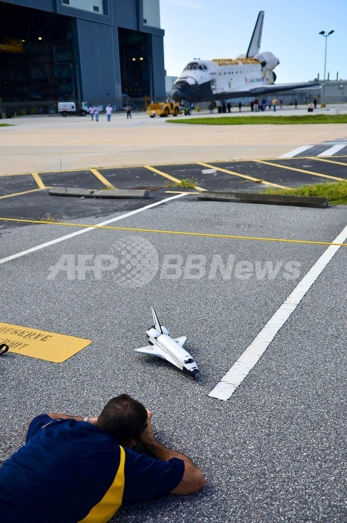 【8月17日 AFP】米フロリダ(Florida)州ケープカナベラル(Cape Canaveral)にある米航空宇宙局(NASA)のケネディ宇宙センター(Kennedy Space Center)で16日、実物を背景にスペースシャトル「アトランティス(Atlantis)」の精巧な模型の撮影を試みる来場者の男性。2011年に30年に及ぶ歴史に終止符を打った退役シャトルのうち、「エンデバー(Endeavour)」は今後カリフォルニア科学センター(California Science Center)に移送され常設展示されるが、「アトランティス」は引き続きケネディ宇宙センターで一般公開される。(c)AFP/Getty Images
