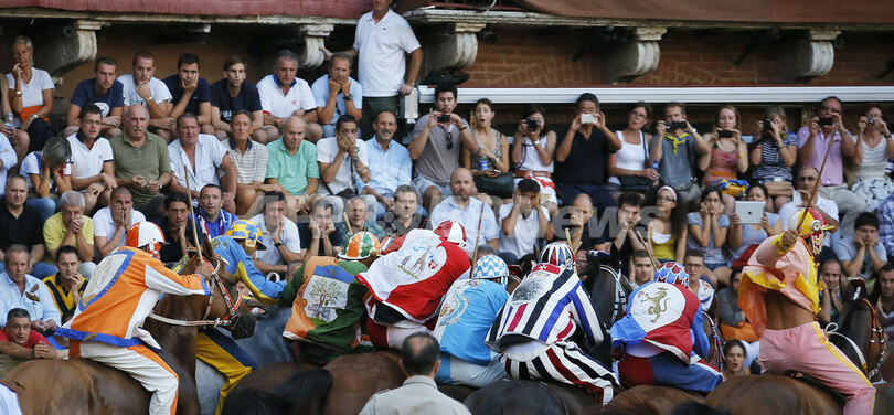 【8月17日 AFP】イタリア・シエナ(Siena)で16日、伝統的な競馬の祭り「パリオ(Palio)」が開催された。「パリオ」は年に2回、シエナ中心部のカンポ広場(Piazza del Campo)に作られた臨時コースを舞台に、各地区代表の騎手たちがくらを置かない裸馬を駆ってレースをするもので、中世から続く伝統行事。16日は「子羊」地区の代表として出場したジョナタン・バルトレッティ(Jonatan Bartoletti)さんが優勝した。(c)AFP