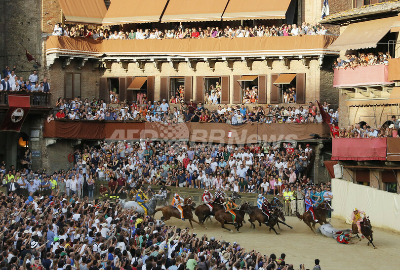 【8月17日 AFP】イタリア・シエナ(Siena)で16日、伝統的な競馬の祭り「パリオ(Palio)」が開催された。「パリオ」は年に2回、シエナ中心部のカンポ広場(Piazza del Campo)に作られた臨時コースを舞台に、各地区代表の騎手たちがくらを置かない裸馬を駆ってレースをするもので、中世から続く伝統行事。16日は「子羊」地区の代表として出場したジョナタン・バルトレッティ(Jonatan Bartoletti)さんが優勝した。(c)AFP