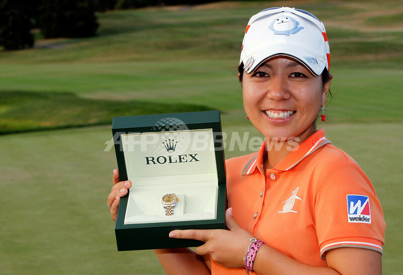 ロレックス(Rolex)の時計を手に写真撮影に臨む宮里美香(2012年8月19日撮影)。(c)AFP/Getty Images/ Jonathan Ferrey