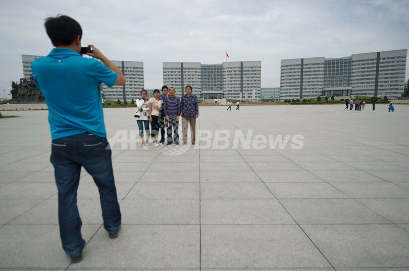 写真はチンギスハン広場で、政府庁舎を背景に記念撮影する人々(2012年8月18日撮影)。(c)AFP/Ed Jones