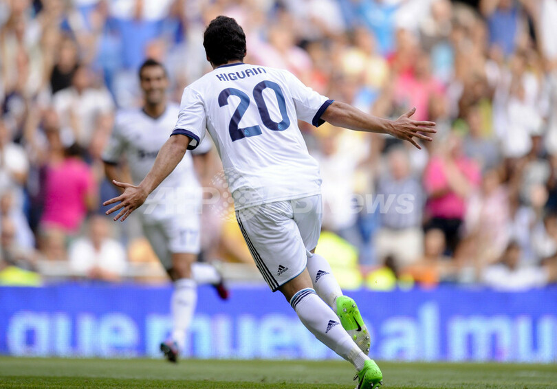 前半10分に先制点を挙げ、歓喜するレアル・マドリードのゴンサロ・イグアイン(Gonzalo Higuain、2012年8月19日撮影)。(c)AFP/Pedro ARMESTRE