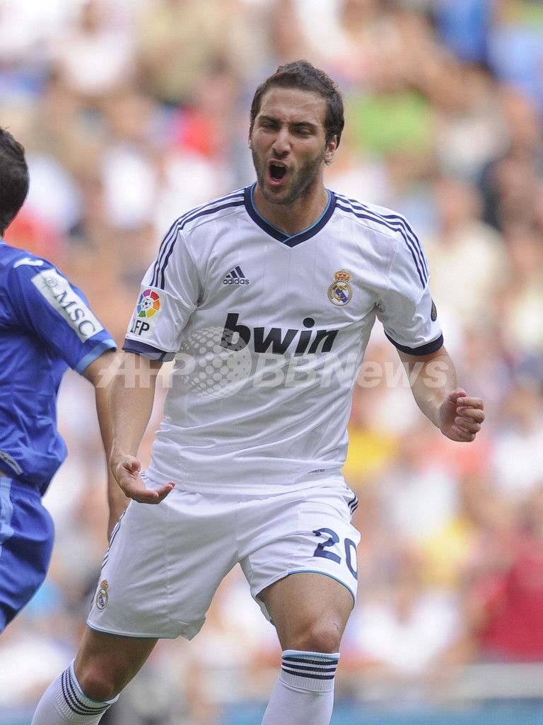 前半10分に先制点を挙げ、歓喜するレアル・マドリードのゴンサロ・イグアイン(Gonzalo Higuain、2012年8月19日撮影)。(c)AFP/Pedro ARMESTRE