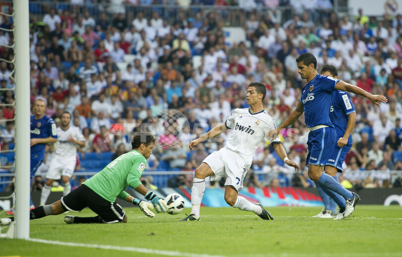 バレンシアのゴールキーパー(GK)ジエゴ(Diego Alves Carreira、左)とボールを競るレアル・マドリードのクリスティアーノ・ロナウド(Cristiano Ronaldo、中央、2012年8月19日撮影)。(c)AFP/DANI POZO