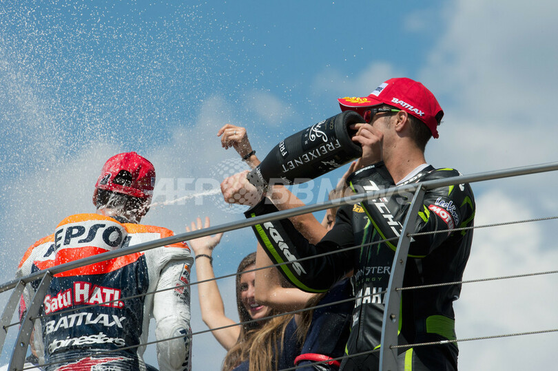 表彰台でモンスター・ヤマハ・テック3(Monster Yamaha Tech 3)のアンドレア・ドビツィオーゾ(Andrea Dovizioso)からシャンパンを浴びるダニ・ペドロサ(2012年8月19日撮影)。(c)AFP/Getty Images/Mirco Lazzari