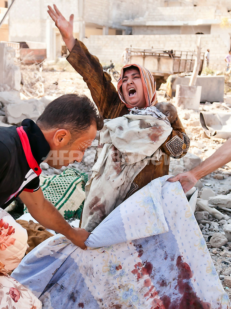 写真は北部アレッポ(Aleppo)近郊のアザーズ(Azaaz)で、空爆で殺害された夫の遺体の脇で、赤ちゃんの遺体を抱いて泣き叫ぶ女性(2012年8月15日撮影)。(c)AFP/VEDAT XHYMSHITI