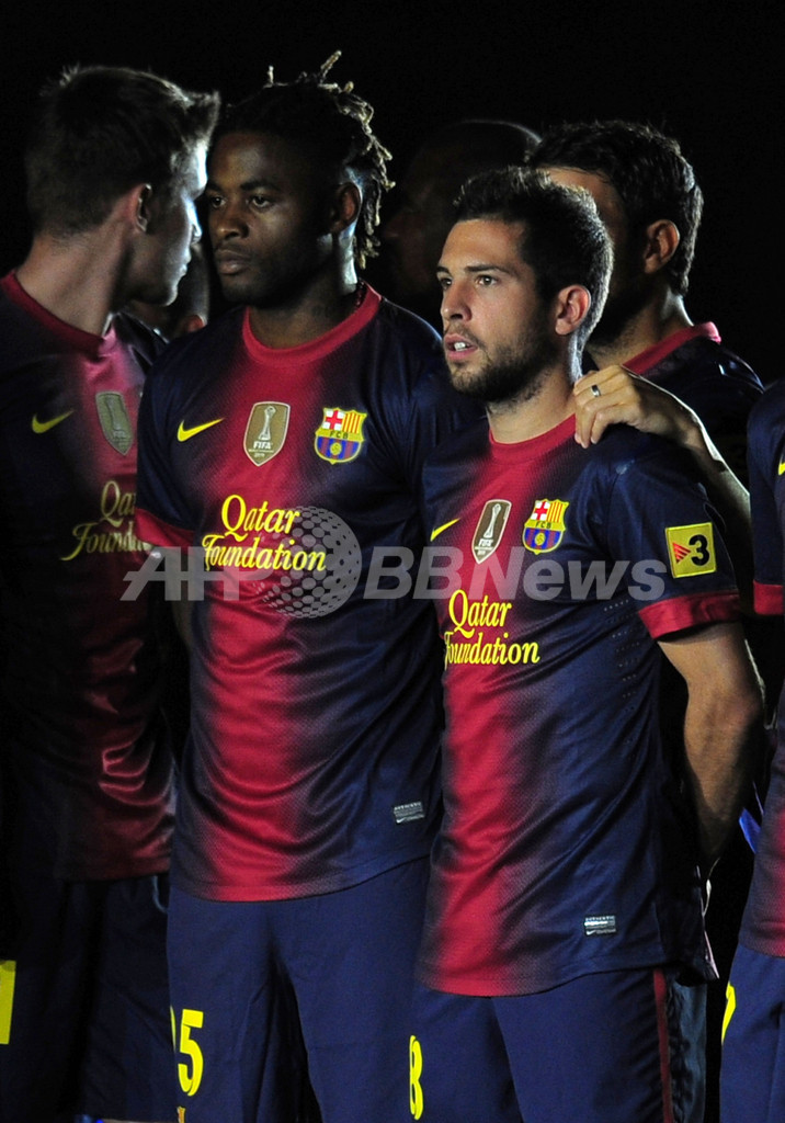 試合前のピッチに姿を見せたFCバルセロナのアレクサンドル・ソング(Alexandre Song)とジョディ・アルバ(Jordi Alba、2012年8月20日撮影)。(c)AFP/LLUIS GENE