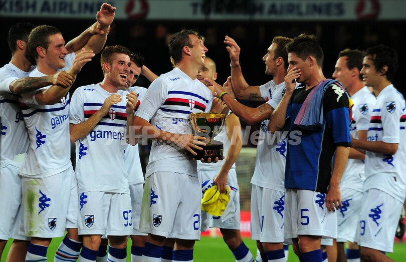 試合に勝利し歓喜するサンプドリアの選手(2012年8月20日撮影)。(c)AFP/LLUIS GENE